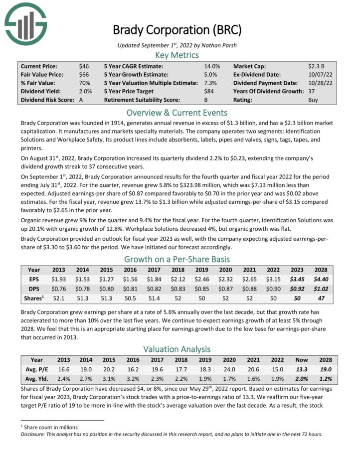 On August 31st, 2022, Brady Corporation increased its quarterly dividend 2.2% to $0.23, extending the company’s dividend growth streak to 37 consecutive years.