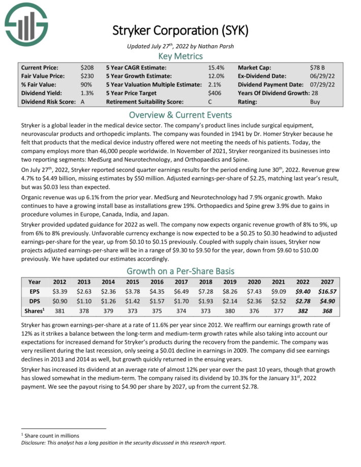 Stryker provided updated guidance for 2022 as well. The company now expects organic revenue growth of 8% to 9%, up from 6% to 8% previously. Unfavorable currency exchange is now expected to be a $0.25 to $0.30 headwind to adjusted earnings-per-share for the year, up from $0.10 to $0.15 previously. Coupled with supply chain issues, Stryker now projects adjusted earnings-per-share will be in a range of $9.30 to $9.50 for the year, down from $9.60 to $10.00 previously.